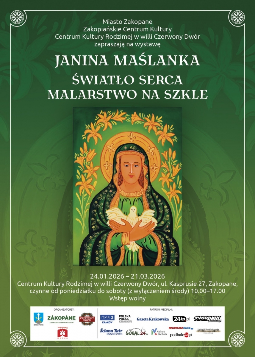 Centrum Kultury Rodzimej w willi Czerwony Dwór - Zakopane zaprasza na wernisaż wystawy JANINA MAŚLANKA "ŚWIATŁO SERCA - MALARSTWO NA SZKLE" - 23 stycznia, godz. 17.00.