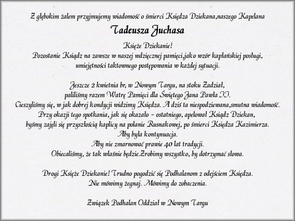 Podhale24.pl zastrzega sobie prawo do nie publikowania wspomnień, w szczególności tych nie związanych z profilem działu nekrologi, zawierających wulgaryzmy, wzywających do zachowań niezgodnych z prawem, obrażających osoby publiczne i prywatne, obrażających inne narodowości, rasy, religie itd, oraz te, bez możliwości telefonicznej lub mailowej weryfikacji ich autora.