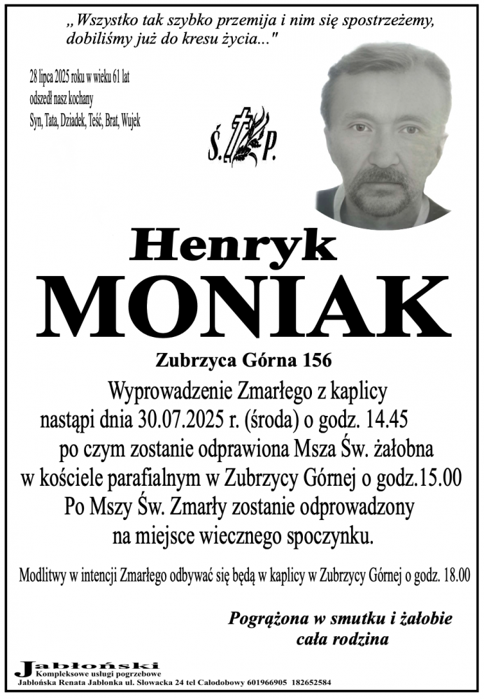 Podhale24.pl zastrzega sobie prawo do nie publikowania wspomnień, w szczególności tych nie związanych z profilem działu nekrologi, zawierających wulgaryzmy, wzywających do zachowań niezgodnych z prawem, obrażających osoby publiczne i prywatne, obrażających inne narodowości, rasy, religie itd, oraz te, bez możliwości telefonicznej lub mailowej weryfikacji ich autora.