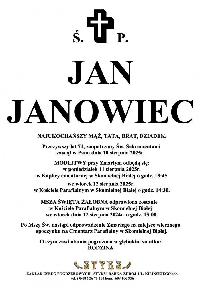 Podhale24.pl zastrzega sobie prawo do nie publikowania wspomnień, w szczególności tych nie związanych z profilem działu nekrologi, zawierających wulgaryzmy, wzywających do zachowań niezgodnych z prawem, obrażających osoby publiczne i prywatne, obrażających inne narodowości, rasy, religie itd, oraz te, bez możliwości telefonicznej lub mailowej weryfikacji ich autora.