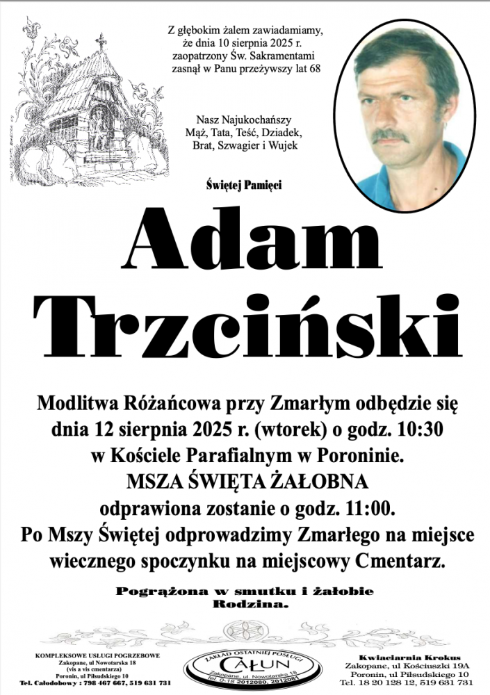 Podhale24.pl zastrzega sobie prawo do nie publikowania wspomnień, w szczególności tych nie związanych z profilem działu nekrologi, zawierających wulgaryzmy, wzywających do zachowań niezgodnych z prawem, obrażających osoby publiczne i prywatne, obrażających inne narodowości, rasy, religie itd, oraz te, bez możliwości telefonicznej lub mailowej weryfikacji ich autora.