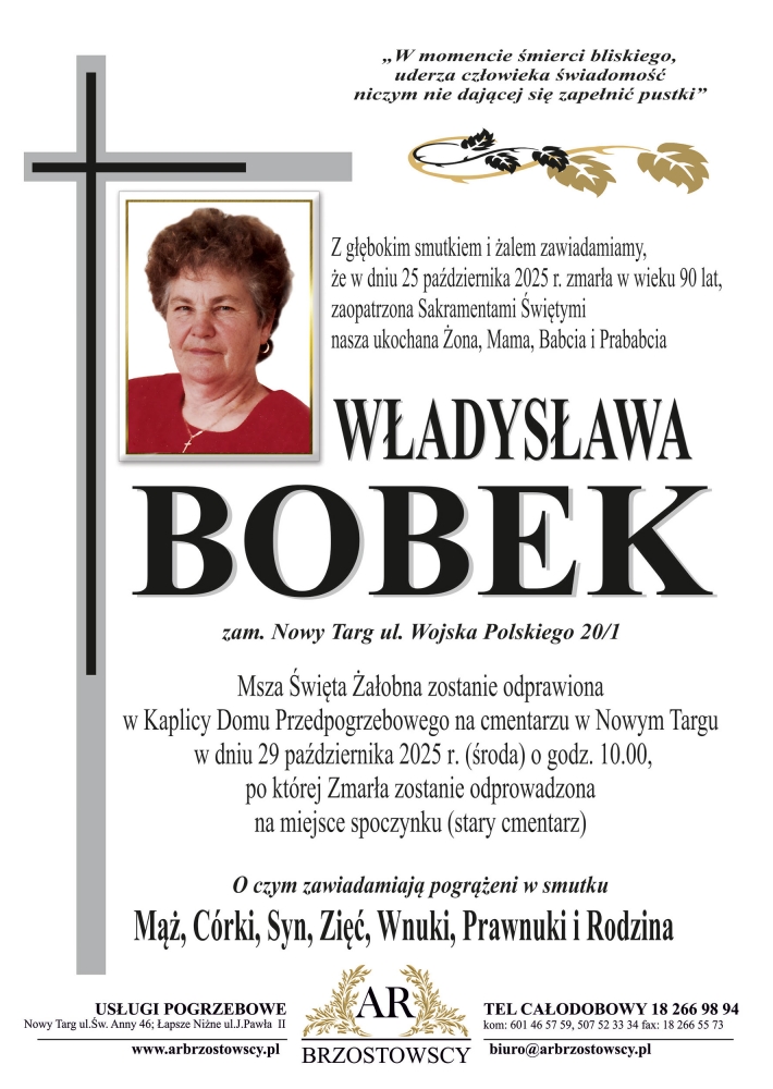 Podhale24.pl zastrzega sobie prawo do nie publikowania wspomnień, w szczególności tych nie związanych z profilem działu nekrologi, zawierających wulgaryzmy, wzywających do zachowań niezgodnych z prawem, obrażających osoby publiczne i prywatne, obrażających inne narodowości, rasy, religie itd, oraz te, bez możliwości telefonicznej lub mailowej weryfikacji ich autora.