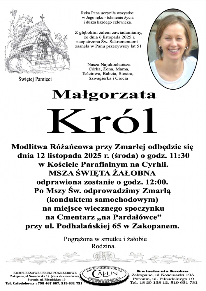 Podhale24.pl zastrzega sobie prawo do nie publikowania wspomnień, w szczególności tych nie związanych z profilem działu nekrologi, zawierających wulgaryzmy, wzywających do zachowań niezgodnych z prawem, obrażających osoby publiczne i prywatne, obrażających inne narodowości, rasy, religie itd, oraz te, bez możliwości telefonicznej lub mailowej weryfikacji ich autora.