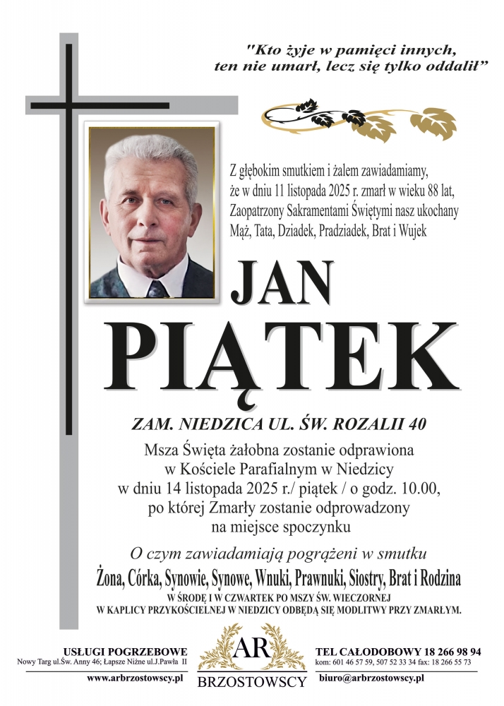 Podhale24.pl zastrzega sobie prawo do nie publikowania wspomnień, w szczególności tych nie związanych z profilem działu nekrologi, zawierających wulgaryzmy, wzywających do zachowań niezgodnych z prawem, obrażających osoby publiczne i prywatne, obrażających inne narodowości, rasy, religie itd, oraz te, bez możliwości telefonicznej lub mailowej weryfikacji ich autora.