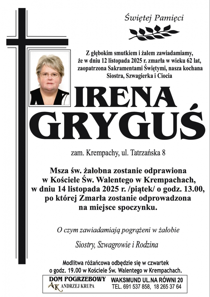 Irena Gryguś - Nekrologi - podhale24.pl