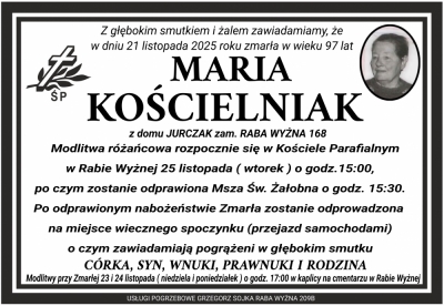 Podhale24.pl zastrzega sobie prawo do nie publikowania wspomnień, w szczególności tych nie związanych z profilem działu nekrologi, zawierających wulgaryzmy, wzywających do zachowań niezgodnych z prawem, obrażających osoby publiczne i prywatne, obrażających inne narodowości, rasy, religie itd, oraz te, bez możliwości telefonicznej lub mailowej weryfikacji ich autora.
