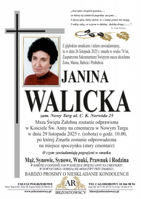 Podhale24.pl zastrzega sobie prawo do nie publikowania wspomnień, w szczególności tych nie związanych z profilem działu nekrologi, zawierających wulgaryzmy, wzywających do zachowań niezgodnych z prawem, obrażających osoby publiczne i prywatne, obrażających inne narodowości, rasy, religie itd, oraz te, bez możliwości telefonicznej lub mailowej weryfikacji ich autora.