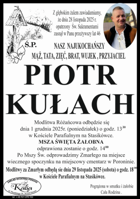 Podhale24.pl zastrzega sobie prawo do nie publikowania wspomnień, w szczególności tych nie związanych z profilem działu nekrologi, zawierających wulgaryzmy, wzywających do zachowań niezgodnych z prawem, obrażających osoby publiczne i prywatne, obrażających inne narodowości, rasy, religie itd, oraz te, bez możliwości telefonicznej lub mailowej weryfikacji ich autora.