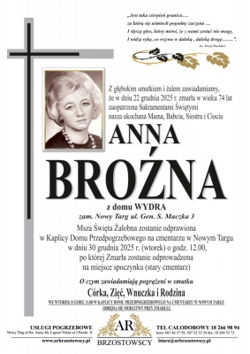 Podhale24.pl zastrzega sobie prawo do nie publikowania wspomnień, w szczególności tych nie związanych z profilem działu nekrologi, zawierających wulgaryzmy, wzywających do zachowań niezgodnych z prawem, obrażających osoby publiczne i prywatne, obrażających inne narodowości, rasy, religie itd, oraz te, bez możliwości telefonicznej lub mailowej weryfikacji ich autora.