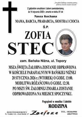 Podhale24.pl zastrzega sobie prawo do nie publikowania wspomnień, w szczególności tych nie związanych z profilem działu nekrologi, zawierających wulgaryzmy, wzywających do zachowań niezgodnych z prawem, obrażających osoby publiczne i prywatne, obrażających inne narodowości, rasy, religie itd, oraz te, bez możliwości telefonicznej lub mailowej weryfikacji ich autora.