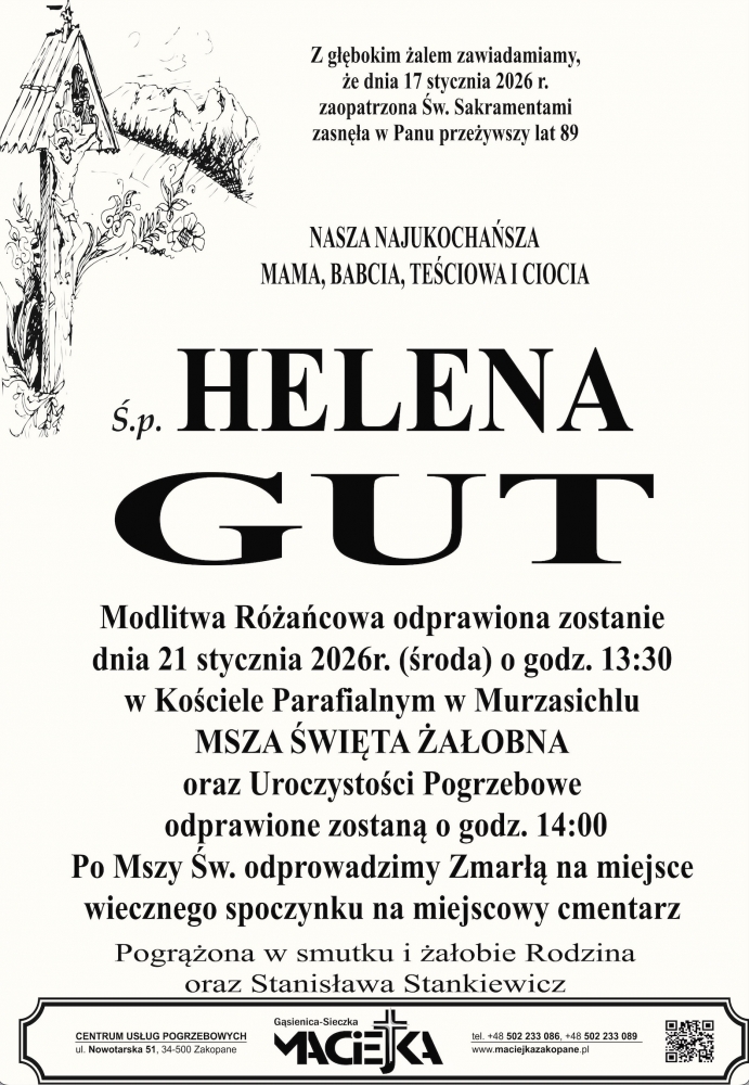 Podhale24.pl zastrzega sobie prawo do nie publikowania wspomnień, w szczególności tych nie związanych z profilem działu nekrologi, zawierających wulgaryzmy, wzywających do zachowań niezgodnych z prawem, obrażających osoby publiczne i prywatne, obrażających inne narodowości, rasy, religie itd, oraz te, bez możliwości telefonicznej lub mailowej weryfikacji ich autora.