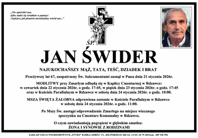 Podhale24.pl zastrzega sobie prawo do nie publikowania wspomnień, w szczególności tych nie związanych z profilem działu nekrologi, zawierających wulgaryzmy, wzywających do zachowań niezgodnych z prawem, obrażających osoby publiczne i prywatne, obrażających inne narodowości, rasy, religie itd, oraz te, bez możliwości telefonicznej lub mailowej weryfikacji ich autora.