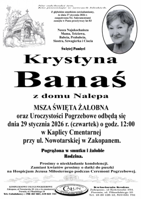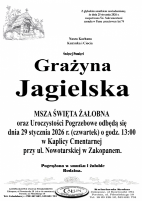 Podhale24.pl zastrzega sobie prawo do nie publikowania wspomnień, w szczególności tych nie związanych z profilem działu nekrologi, zawierających wulgaryzmy, wzywających do zachowań niezgodnych z prawem, obrażających osoby publiczne i prywatne, obrażających inne narodowości, rasy, religie itd, oraz te, bez możliwości telefonicznej lub mailowej weryfikacji ich autora.