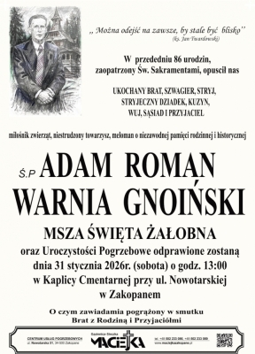 Podhale24.pl zastrzega sobie prawo do nie publikowania wspomnień, w szczególności tych nie związanych z profilem działu nekrologi, zawierających wulgaryzmy, wzywających do zachowań niezgodnych z prawem, obrażających osoby publiczne i prywatne, obrażających inne narodowości, rasy, religie itd, oraz te, bez możliwości telefonicznej lub mailowej weryfikacji ich autora.