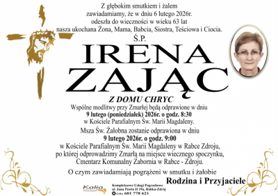Podhale24.pl zastrzega sobie prawo do nie publikowania wspomnień, w szczególności tych nie związanych z profilem działu nekrologi, zawierających wulgaryzmy, wzywających do zachowań niezgodnych z prawem, obrażających osoby publiczne i prywatne, obrażających inne narodowości, rasy, religie itd, oraz te, bez możliwości telefonicznej lub mailowej weryfikacji ich autora.