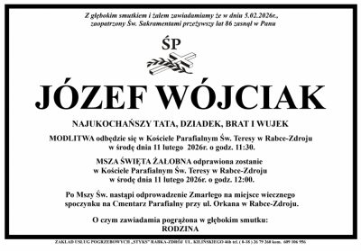 Podhale24.pl zastrzega sobie prawo do nie publikowania wspomnień, w szczególności tych nie związanych z profilem działu nekrologi, zawierających wulgaryzmy, wzywających do zachowań niezgodnych z prawem, obrażających osoby publiczne i prywatne, obrażających inne narodowości, rasy, religie itd, oraz te, bez możliwości telefonicznej lub mailowej weryfikacji ich autora.