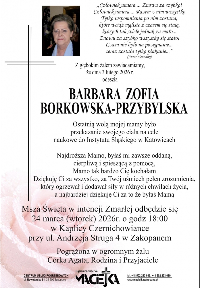 Barbara Zofia Borkowska-Przybylska - Nekrologi - podhale24.pl