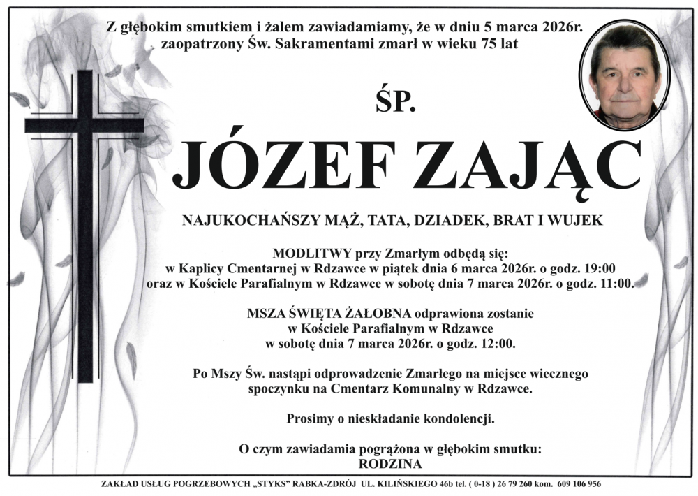 Podhale24.pl zastrzega sobie prawo do nie publikowania wspomnień, w szczególności tych nie związanych z profilem działu nekrologi, zawierających wulgaryzmy, wzywających do zachowań niezgodnych z prawem, obrażających osoby publiczne i prywatne, obrażających inne narodowości, rasy, religie itd, oraz te, bez możliwości telefonicznej lub mailowej weryfikacji ich autora.