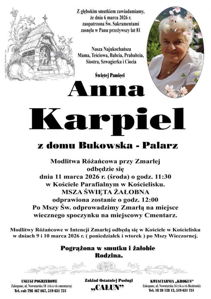 Podhale24.pl zastrzega sobie prawo do nie publikowania wspomnień, w szczególności tych nie związanych z profilem działu nekrologi, zawierających wulgaryzmy, wzywających do zachowań niezgodnych z prawem, obrażających osoby publiczne i prywatne, obrażających inne narodowości, rasy, religie itd, oraz te, bez możliwości telefonicznej lub mailowej weryfikacji ich autora.