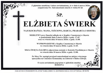 Podhale24.pl zastrzega sobie prawo do nie publikowania wspomnień, w szczególności tych nie związanych z profilem działu nekrologi, zawierających wulgaryzmy, wzywających do zachowań niezgodnych z prawem, obrażających osoby publiczne i prywatne, obrażających inne narodowości, rasy, religie itd, oraz te, bez możliwości telefonicznej lub mailowej weryfikacji ich autora.