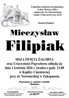 Podhale24.pl zastrzega sobie prawo do nie publikowania wspomnień, w szczególności tych nie związanych z profilem działu nekrologi, zawierających wulgaryzmy, wzywających do zachowań niezgodnych z prawem, obrażających osoby publiczne i prywatne, obrażających inne narodowości, rasy, religie itd, oraz te, bez możliwości telefonicznej lub mailowej weryfikacji ich autora.