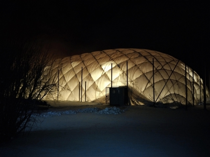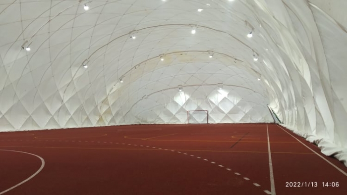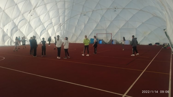 Uczniowie szkoły przed lekcjami wychowania fizycznego przebierają się w stroje sportowe w budynku szkoły, następnie w ubraniu wierzchnim przechodzą do hali pneumatycznej, gdzie uczestniczą w zajęciach sportowych.