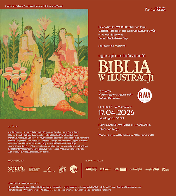 W Galerii Sztuki BWA JATKI w Nowym Targu - o/ Małopolskiego Centrum Kultury SOKÓŁ w Nowym Sączu - można już oglądać nową wystawę: "Ogarnąć nieskończoność. Biblia w ilustracji." - ze zbiorów Biura Wystaw Artystycznych - Galeria Zamojska