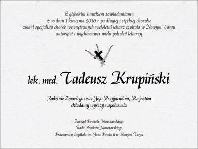 Podhale24.pl zastrzega sobie prawo do nie publikowania wspomnień, w szczególności tych nie związanych z profilem działu nekrologi, zawierających wulgaryzmy, wzywających do zachowań niezgodnych z prawem, obrażających osoby publiczne i prywatne, obrażających inne narodowości, rasy, religie itd, oraz te, bez możliwości telefonicznej lub mailowej weryfikacji ich autora.