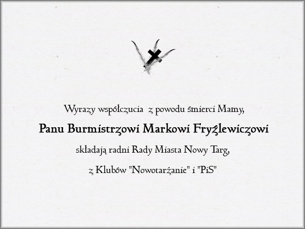 Podhale24.pl zastrzega sobie prawo do nie publikowania wspomnień, w szczególności tych nie związanych z profilem działu nekrologi, zawierających wulgaryzmy, wzywających do zachowań niezgodnych z prawem, obrażających osoby publiczne i prywatne, obrażających inne narodowości, rasy, religie itd, oraz te, bez możliwości telefonicznej lub mailowej weryfikacji ich autora.