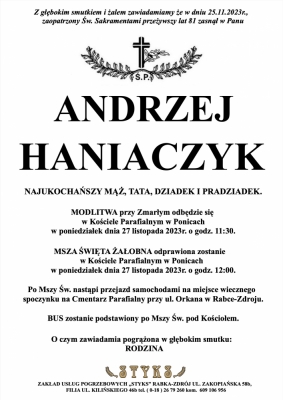 Podhale24.pl zastrzega sobie prawo do nie publikowania wspomnień, w szczególności tych nie związanych z profilem działu nekrologi, zawierających wulgaryzmy, wzywających do zachowań niezgodnych z prawem, obrażających osoby publiczne i prywatne, obrażających inne narodowości, rasy, religie itd, oraz te, bez możliwości telefonicznej lub mailowej weryfikacji ich autora.