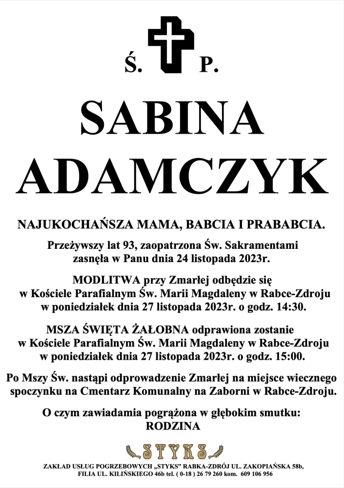 Sabina Adamczyk - Nekrologi - podhale24.pl