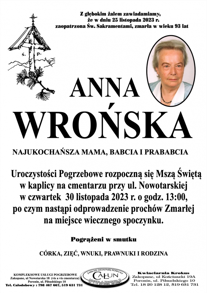 Podhale24.pl zastrzega sobie prawo do nie publikowania wspomnień, w szczególności tych nie związanych z profilem działu nekrologi, zawierających wulgaryzmy, wzywających do zachowań niezgodnych z prawem, obrażających osoby publiczne i prywatne, obrażających inne narodowości, rasy, religie itd, oraz te, bez możliwości telefonicznej lub mailowej weryfikacji ich autora.