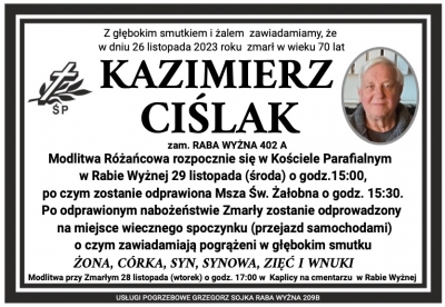 Podhale24.pl zastrzega sobie prawo do nie publikowania wspomnień, w szczególności tych nie związanych z profilem działu nekrologi, zawierających wulgaryzmy, wzywających do zachowań niezgodnych z prawem, obrażających osoby publiczne i prywatne, obrażających inne narodowości, rasy, religie itd, oraz te, bez możliwości telefonicznej lub mailowej weryfikacji ich autora.