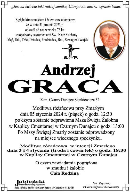 Podhale24.pl zastrzega sobie prawo do nie publikowania wspomnień, w szczególności tych nie związanych z profilem działu nekrologi, zawierających wulgaryzmy, wzywających do zachowań niezgodnych z prawem, obrażających osoby publiczne i prywatne, obrażających inne narodowości, rasy, religie itd, oraz te, bez możliwości telefonicznej lub mailowej weryfikacji ich autora.