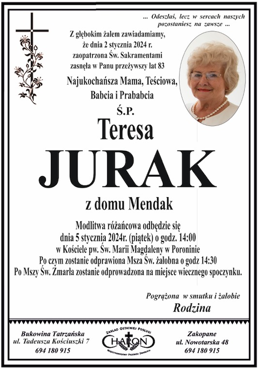 Podhale24.pl zastrzega sobie prawo do nie publikowania wspomnień, w szczególności tych nie związanych z profilem działu nekrologi, zawierających wulgaryzmy, wzywających do zachowań niezgodnych z prawem, obrażających osoby publiczne i prywatne, obrażających inne narodowości, rasy, religie itd, oraz te, bez możliwości telefonicznej lub mailowej weryfikacji ich autora.