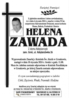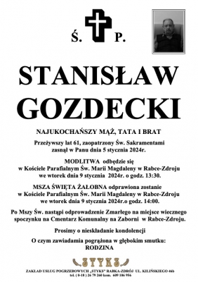 Podhale24.pl zastrzega sobie prawo do nie publikowania wspomnień, w szczególności tych nie związanych z profilem działu nekrologi, zawierających wulgaryzmy, wzywających do zachowań niezgodnych z prawem, obrażających osoby publiczne i prywatne, obrażających inne narodowości, rasy, religie itd, oraz te, bez możliwości telefonicznej lub mailowej weryfikacji ich autora.
