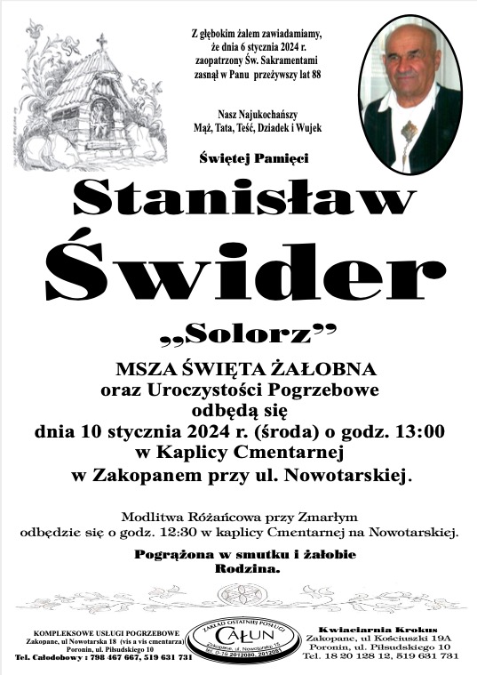 Podhale24.pl zastrzega sobie prawo do nie publikowania wspomnień, w szczególności tych nie związanych z profilem działu nekrologi, zawierających wulgaryzmy, wzywających do zachowań niezgodnych z prawem, obrażających osoby publiczne i prywatne, obrażających inne narodowości, rasy, religie itd, oraz te, bez możliwości telefonicznej lub mailowej weryfikacji ich autora.