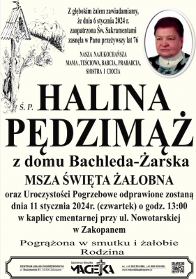 Podhale24.pl zastrzega sobie prawo do nie publikowania wspomnień, w szczególności tych nie związanych z profilem działu nekrologi, zawierających wulgaryzmy, wzywających do zachowań niezgodnych z prawem, obrażających osoby publiczne i prywatne, obrażających inne narodowości, rasy, religie itd, oraz te, bez możliwości telefonicznej lub mailowej weryfikacji ich autora.