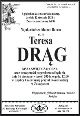 Podhale24.pl zastrzega sobie prawo do nie publikowania wspomnień, w szczególności tych nie związanych z profilem działu nekrologi, zawierających wulgaryzmy, wzywających do zachowań niezgodnych z prawem, obrażających osoby publiczne i prywatne, obrażających inne narodowości, rasy, religie itd, oraz te, bez możliwości telefonicznej lub mailowej weryfikacji ich autora.