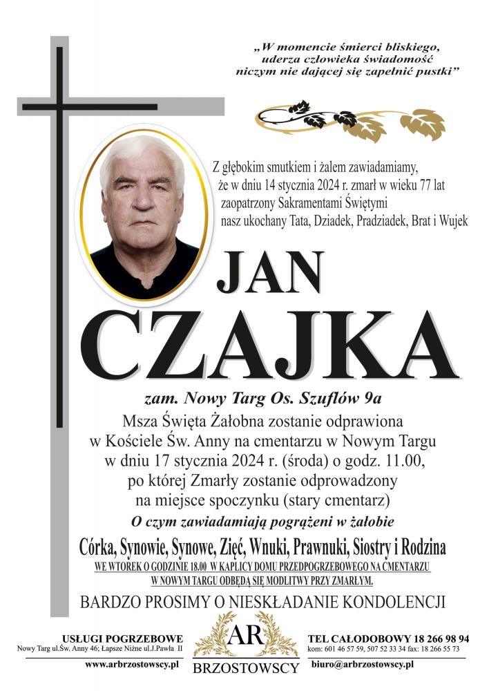 Podhale24.pl zastrzega sobie prawo do nie publikowania wspomnień, w szczególności tych nie związanych z profilem działu nekrologi, zawierających wulgaryzmy, wzywających do zachowań niezgodnych z prawem, obrażających osoby publiczne i prywatne, obrażających inne narodowości, rasy, religie itd, oraz te, bez możliwości telefonicznej lub mailowej weryfikacji ich autora.