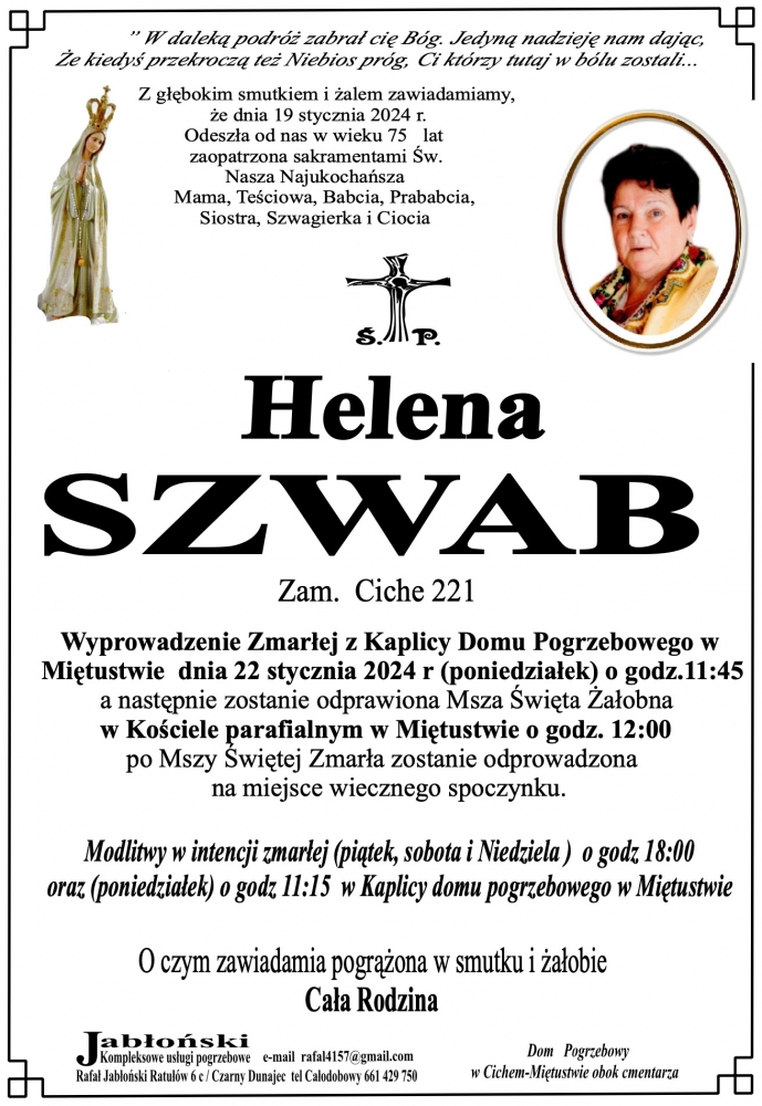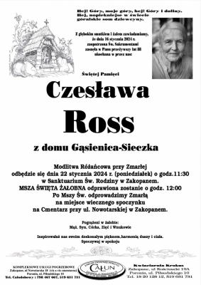 Podhale24.pl zastrzega sobie prawo do nie publikowania wspomnień, w szczególności tych nie związanych z profilem działu nekrologi, zawierających wulgaryzmy, wzywających do zachowań niezgodnych z prawem, obrażających osoby publiczne i prywatne, obrażających inne narodowości, rasy, religie itd, oraz te, bez możliwości telefonicznej lub mailowej weryfikacji ich autora.
