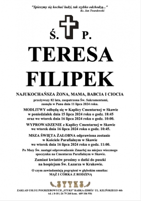 Podhale24.pl zastrzega sobie prawo do nie publikowania wspomnień, w szczególności tych nie związanych z profilem działu nekrologi, zawierających wulgaryzmy, wzywających do zachowań niezgodnych z prawem, obrażających osoby publiczne i prywatne, obrażających inne narodowości, rasy, religie itd, oraz te, bez możliwości telefonicznej lub mailowej weryfikacji ich autora.