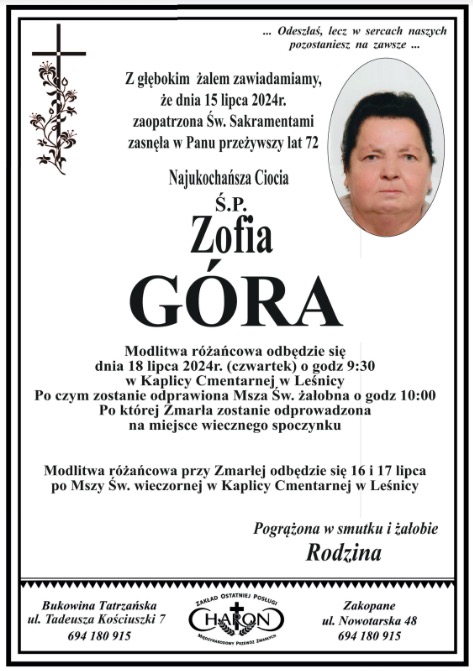 Podhale24.pl zastrzega sobie prawo do nie publikowania wspomnień, w szczególności tych nie związanych z profilem działu nekrologi, zawierających wulgaryzmy, wzywających do zachowań niezgodnych z prawem, obrażających osoby publiczne i prywatne, obrażających inne narodowości, rasy, religie itd, oraz te, bez możliwości telefonicznej lub mailowej weryfikacji ich autora.
