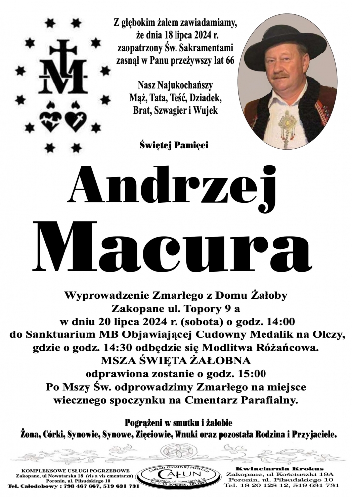 Podhale24.pl zastrzega sobie prawo do nie publikowania wspomnień, w szczególności tych nie związanych z profilem działu nekrologi, zawierających wulgaryzmy, wzywających do zachowań niezgodnych z prawem, obrażających osoby publiczne i prywatne, obrażających inne narodowości, rasy, religie itd, oraz te, bez możliwości telefonicznej lub mailowej weryfikacji ich autora.