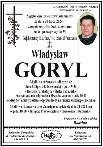 Podhale24.pl zastrzega sobie prawo do nie publikowania wspomnień, w szczególności tych nie związanych z profilem działu nekrologi, zawierających wulgaryzmy, wzywających do zachowań niezgodnych z prawem, obrażających osoby publiczne i prywatne, obrażających inne narodowości, rasy, religie itd, oraz te, bez możliwości telefonicznej lub mailowej weryfikacji ich autora.