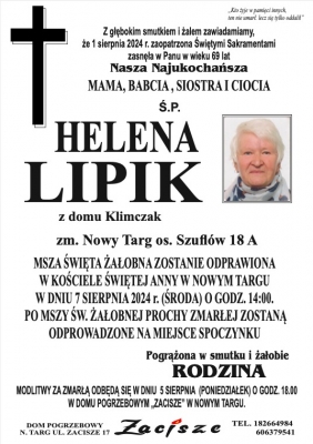Podhale24.pl zastrzega sobie prawo do nie publikowania wspomnień, w szczególności tych nie związanych z profilem działu nekrologi, zawierających wulgaryzmy, wzywających do zachowań niezgodnych z prawem, obrażających osoby publiczne i prywatne, obrażających inne narodowości, rasy, religie itd, oraz te, bez możliwości telefonicznej lub mailowej weryfikacji ich autora.