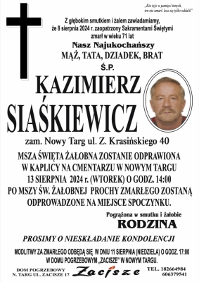Podhale24.pl zastrzega sobie prawo do nie publikowania wspomnień, w szczególności tych nie związanych z profilem działu nekrologi, zawierających wulgaryzmy, wzywających do zachowań niezgodnych z prawem, obrażających osoby publiczne i prywatne, obrażających inne narodowości, rasy, religie itd, oraz te, bez możliwości telefonicznej lub mailowej weryfikacji ich autora.