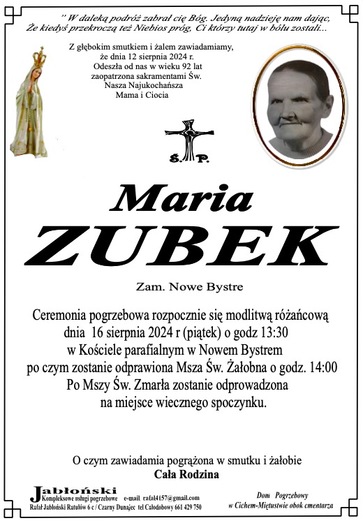 Podhale24.pl zastrzega sobie prawo do nie publikowania wspomnień, w szczególności tych nie związanych z profilem działu nekrologi, zawierających wulgaryzmy, wzywających do zachowań niezgodnych z prawem, obrażających osoby publiczne i prywatne, obrażających inne narodowości, rasy, religie itd, oraz te, bez możliwości telefonicznej lub mailowej weryfikacji ich autora.