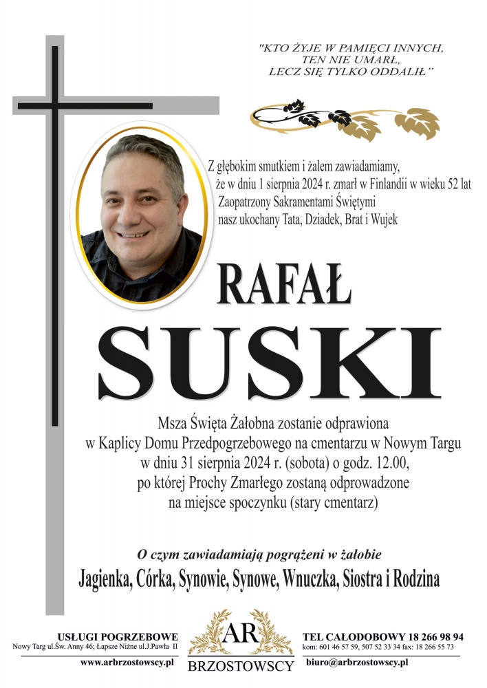 Podhale24.pl zastrzega sobie prawo do nie publikowania wspomnień, w szczególności tych nie związanych z profilem działu nekrologi, zawierających wulgaryzmy, wzywających do zachowań niezgodnych z prawem, obrażających osoby publiczne i prywatne, obrażających inne narodowości, rasy, religie itd, oraz te, bez możliwości telefonicznej lub mailowej weryfikacji ich autora.