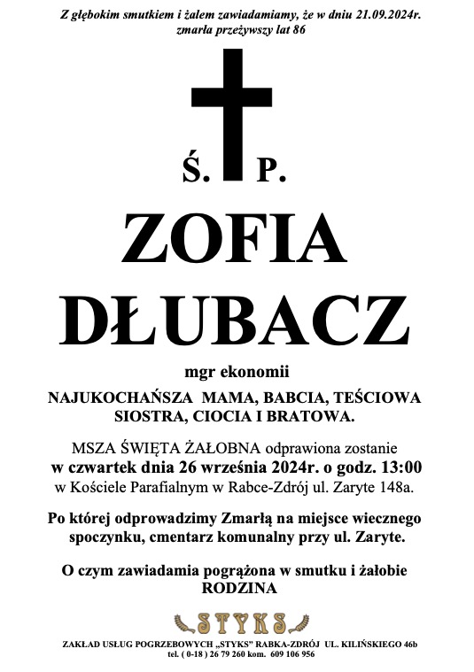 Zofia Dłubacz - Nekrologi - podhale24.pl